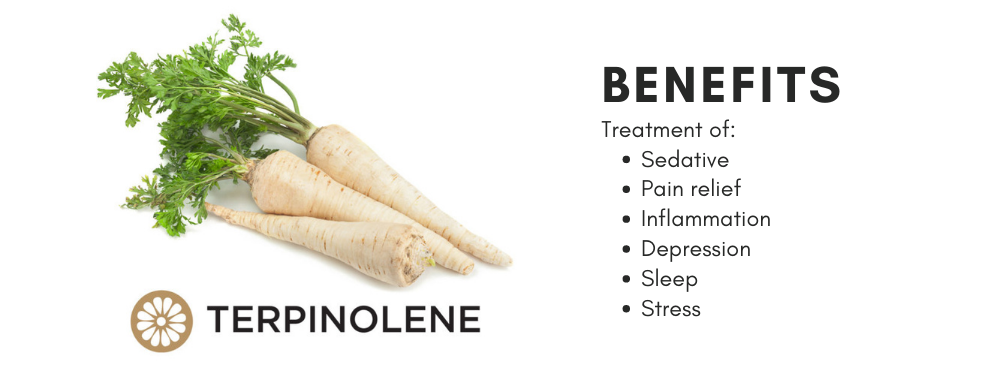Terpinolene is a cannabis terpene found in many strains of the cannabis plant. It is recognizable for its woody aroma, along with citrus and floral notes. Terpinolene is a cyclic monoterpene, common to Pinus spp., but richest in parsnip essential oil (Pastinaca sativa 69%) (Tisserand & Young, 2014). It is also found in citrus fruit oils from orange species such as navel, bergamot, mandarin, sweet orange and tangerine.